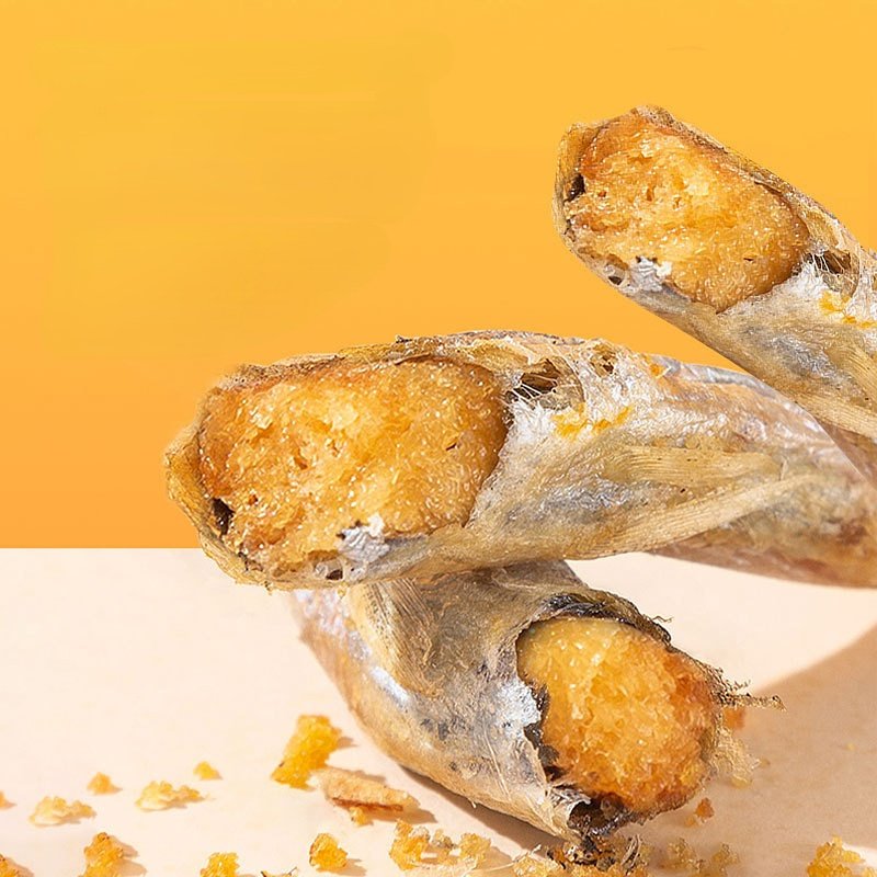 Process: Vacuum freeze-drying technology is used to rapidly freeze fresh spring fish at low temperatures, and then slowly heat up in a vacuum environment, so that the water is directly sublimed from solid to gas, so as to maximize the retention of fish nutrients, flavor and taste.